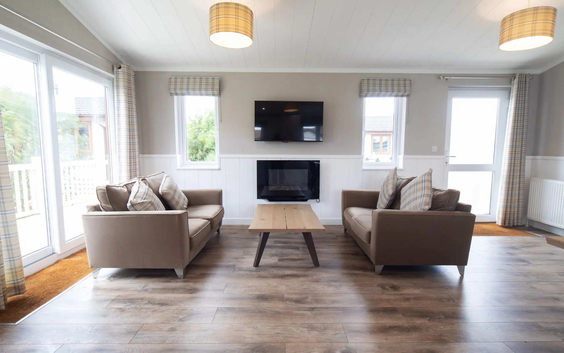 Gold Lodges offer a contemporary aesthetic with open-plan living, modern kitchen, private decking, and included luxurious extras.
