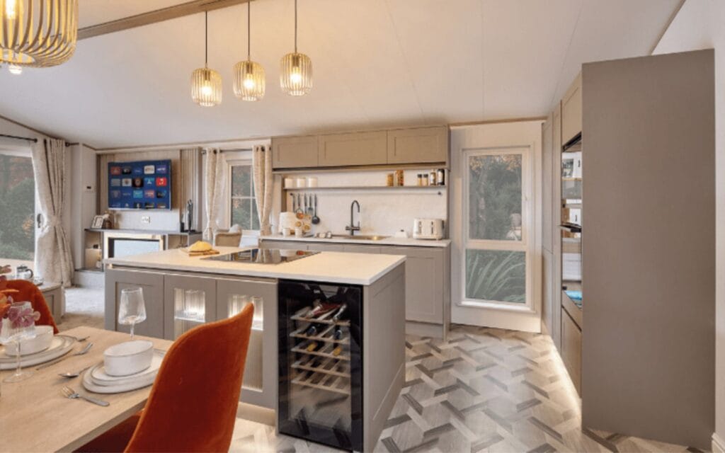 The Willerby Vogue is a flagship holiday home combining modern elegance with practical comfort. Its open-plan lounge and dining space is bright and welcoming, complemented by a premium kitchen with integrated appliances. The master suite includes a walk-in wardrobe and en-suite shower, while contemporary interior touches and striking exterior features give it a stylish, lodge-like appeal.