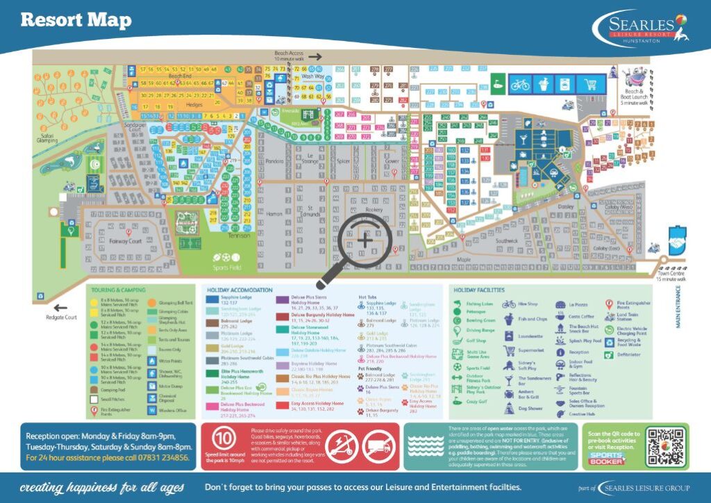 Please note: The main holiday season at Searles Leisure Resort typically runs from March-October. Some facilities shown on the resort map may be subject to seasonal hours of operation. For details on what facilities will be available when you visit please get in touch with our reservations team.
